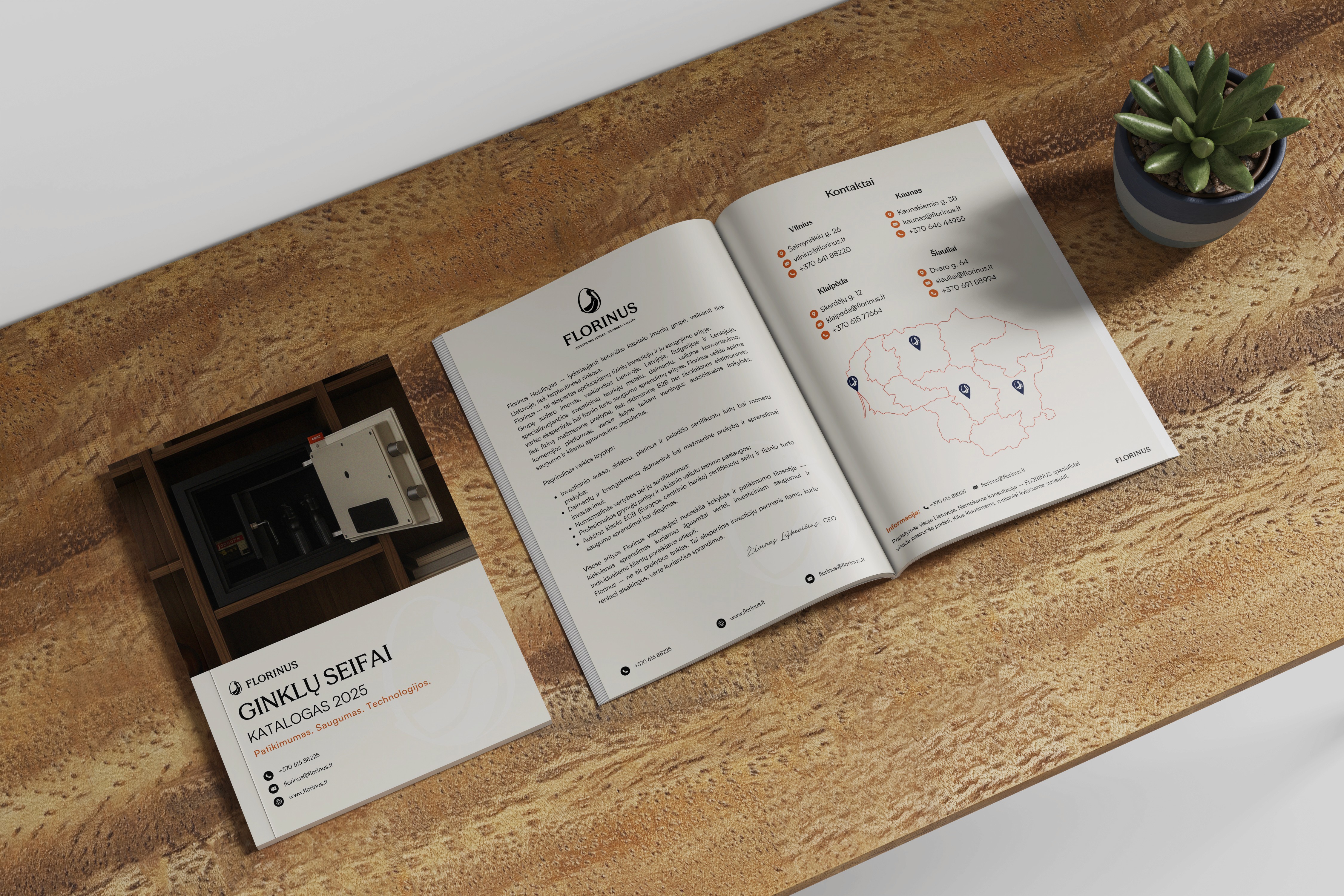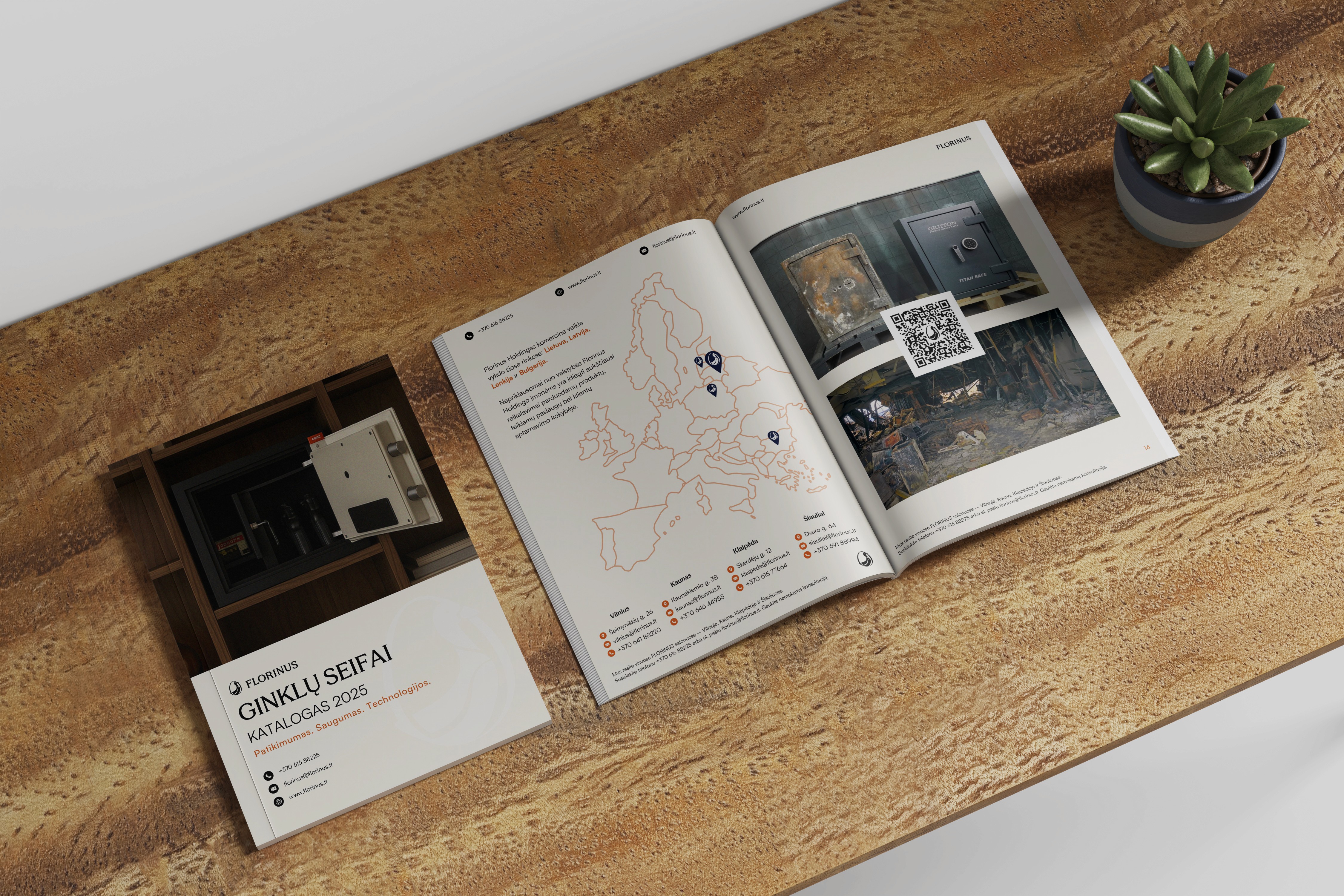 A 2025 firearm safes catalog was designed and prepared for print for UAB Florinus. The catalog combines visual aesthetics with functionality – clearly presenting product information, technical specifications, pricing, and QR codes for quick access to the online store.